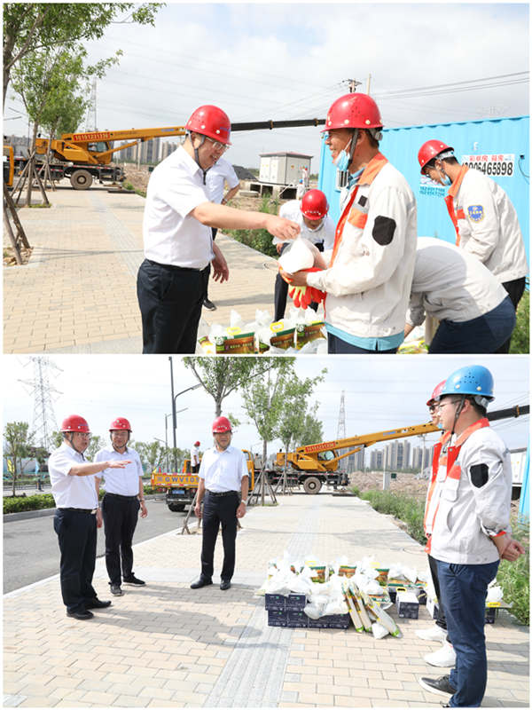 7月28日上午,集團公司黨委副書記戴鴻鳴、工會主席劉承志一行,深入公司施工一線走訪慰問職工,把綠豆、牛奶等防暑降溫用品送到他們手中,在炎炎夏日,為一線職工送去集團公司的深切關懷。 在臺北工地,戴書記與施工人員親切交談,簡要了解了工程的施工情況,叮囑他們在夏日高溫期間要注意安全,做好防暑降溫措施,確保安全生產(chǎn)和身體健康。(電宣)
