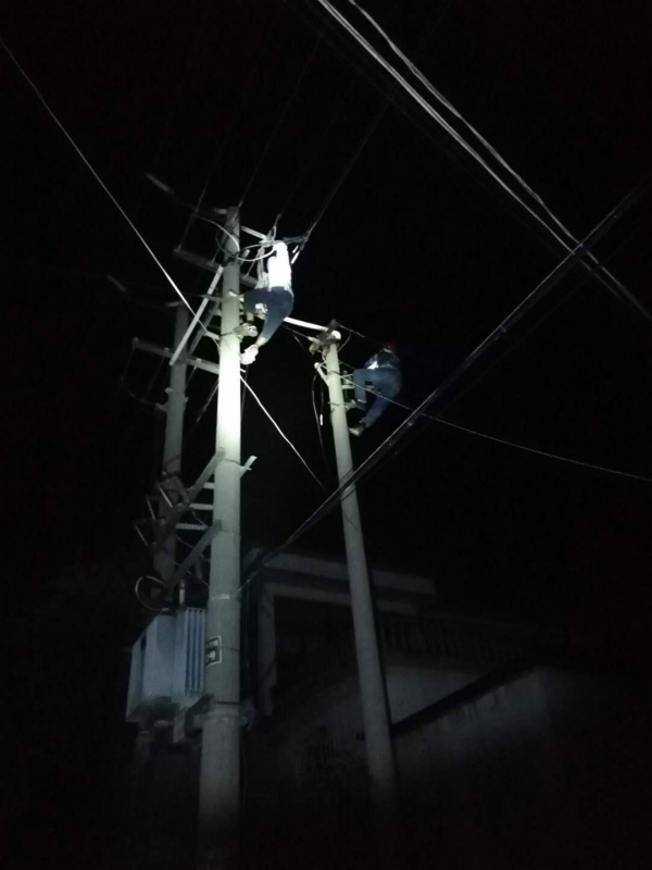 8月5日晚,接到報修電話的值班人員,帶好隨身工具立即到達黃沙一隊查看情況。借著手電發(fā)現(xiàn)一組引線已經(jīng)燒毀。正值天氣炎熱,為了保證居民正常用電,值班人員一邊安撫居民,一邊聯(lián)系值班領(lǐng)導(dǎo)說明情況。值班人員回到所里立即準備搶修材料,值班領(lǐng)導(dǎo)聯(lián)系家住在附近的員工前來支援搶修工作。經(jīng)過近一個半時的奮戰(zhàn),恢復(fù)了居民的用電??匆娂壹覒魬袅疗鹆藷艄猓瑴喩頋裢傅膿屝奕藛T才舒了一口氣。( 盧正遷)