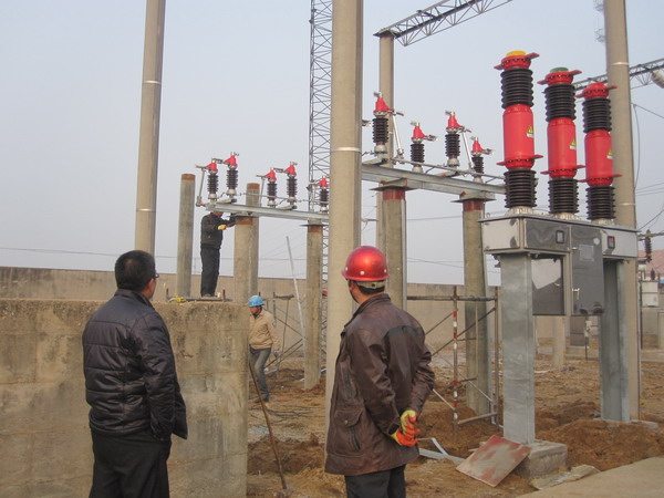 圖為工人們?cè)诎惭b斷路器