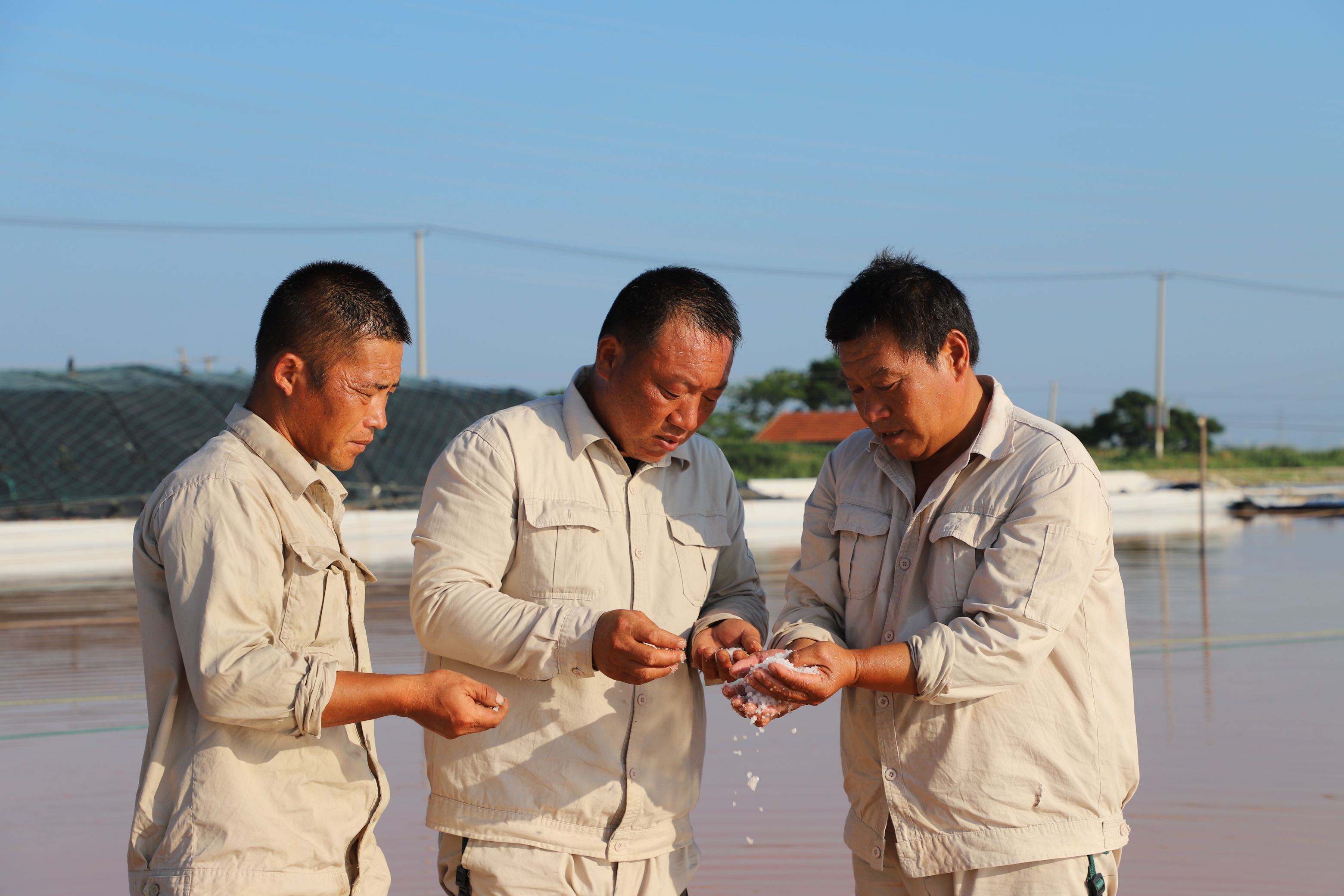 “氣溫越高,鹽的蒸發(fā)量就越高,公司效益就好,按今年的產(chǎn)鹽趨勢,超額完成公司指標(biāo)任務(wù)應(yīng)該不成問題,我們工人心里也高興呀!”勞模祝星星擦著臉上的汗珠自豪的說道?!扒缣煲簧砗?,雨天一身泥”是制鹽人的家常便飯,為確保汛期安全生產(chǎn),避開高溫時段作業(yè),凌晨五點(diǎn)鐘,工人們已忙著鹵水除硫、維護(hù)收拉塑布收房系統(tǒng)、修補(bǔ)塑布……。鹽工身上的汗水與鹵水交織在一起,浸濕了工作服,透過驕陽他們黝黑的臉龐顯得越發(fā)的锃亮。