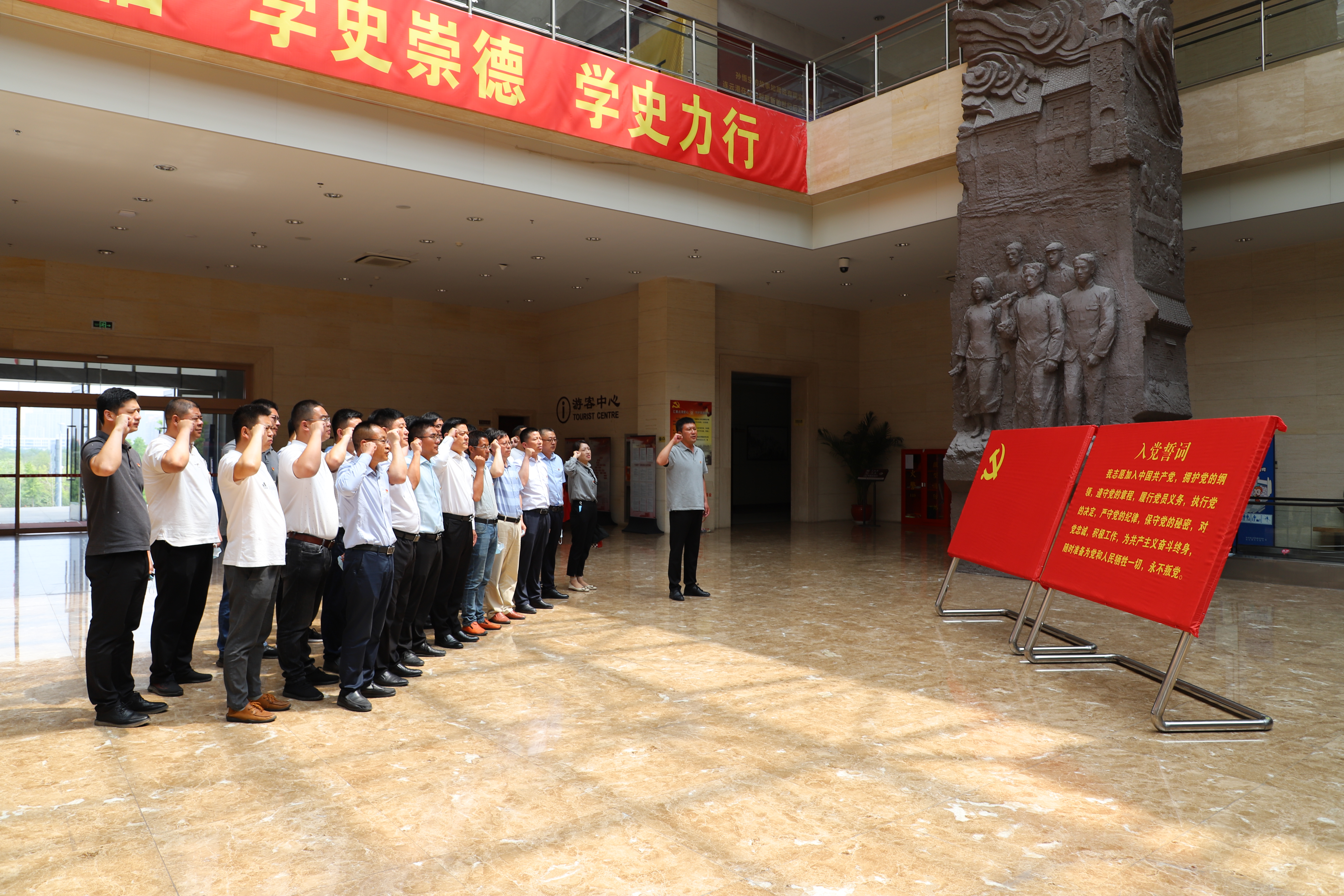 在連云港市革命紀(jì)念館,大家在講解員引導(dǎo)下,依次參觀了五四運(yùn)動(dòng)時(shí)期展廳、土地革命時(shí)期展廳、抗日戰(zhàn)爭(zhēng)時(shí)期展廳。認(rèn)真觀看館內(nèi)歷史圖片、影像資料、珍貴遺物,并在展館內(nèi)重溫入黨誓詞,感受港城人民保衛(wèi)家園、爭(zhēng)取解放、英勇奮戰(zhàn)的大無(wú)畏精神,把連云港從一窮二白、百?gòu)U待興走向欣欣向榮、繁榮富強(qiáng)的發(fā)展歷程。