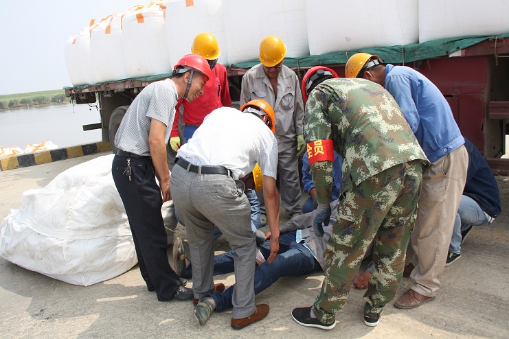 在這次的安全演練中,投資公司運(yùn)營(yíng)監(jiān)管部部長(zhǎng)李長(zhǎng)軍主持了這次的安全演練活動(dòng),宵洋物流公司碼頭當(dāng)班作業(yè)人員參與演練。在五灌河碼頭,正在吊裝的噸袋脫落,砸在一名操作人員的腿上,安全員王緒銀立即指揮停止作業(yè),作業(yè)現(xiàn)場(chǎng)安全負(fù)責(zé)人陸應(yīng)兵立即現(xiàn)場(chǎng)指揮人員現(xiàn)場(chǎng)施救,查看傷情,撥打120急救電話,同時(shí)向單位負(fù)責(zé)人沈志兵匯報(bào)。沈志兵及時(shí)趕到現(xiàn)場(chǎng)啟動(dòng)應(yīng)急預(yù)案,疏散場(chǎng)地車輛,讓出120進(jìn)場(chǎng)通道,命令救援小組展開緊急救援,并向公司運(yùn)營(yíng)監(jiān)管部和領(lǐng)導(dǎo)報(bào)告。在救援中,大家各司其職,齊心協(xié)力,配合默契,有條不紊成功完成了此次演練活動(dòng)。通過這次應(yīng)急演練;進(jìn)一步提高了公司員工在發(fā)生安全傷害事故時(shí)的現(xiàn)場(chǎng)處置能力和自救能力。