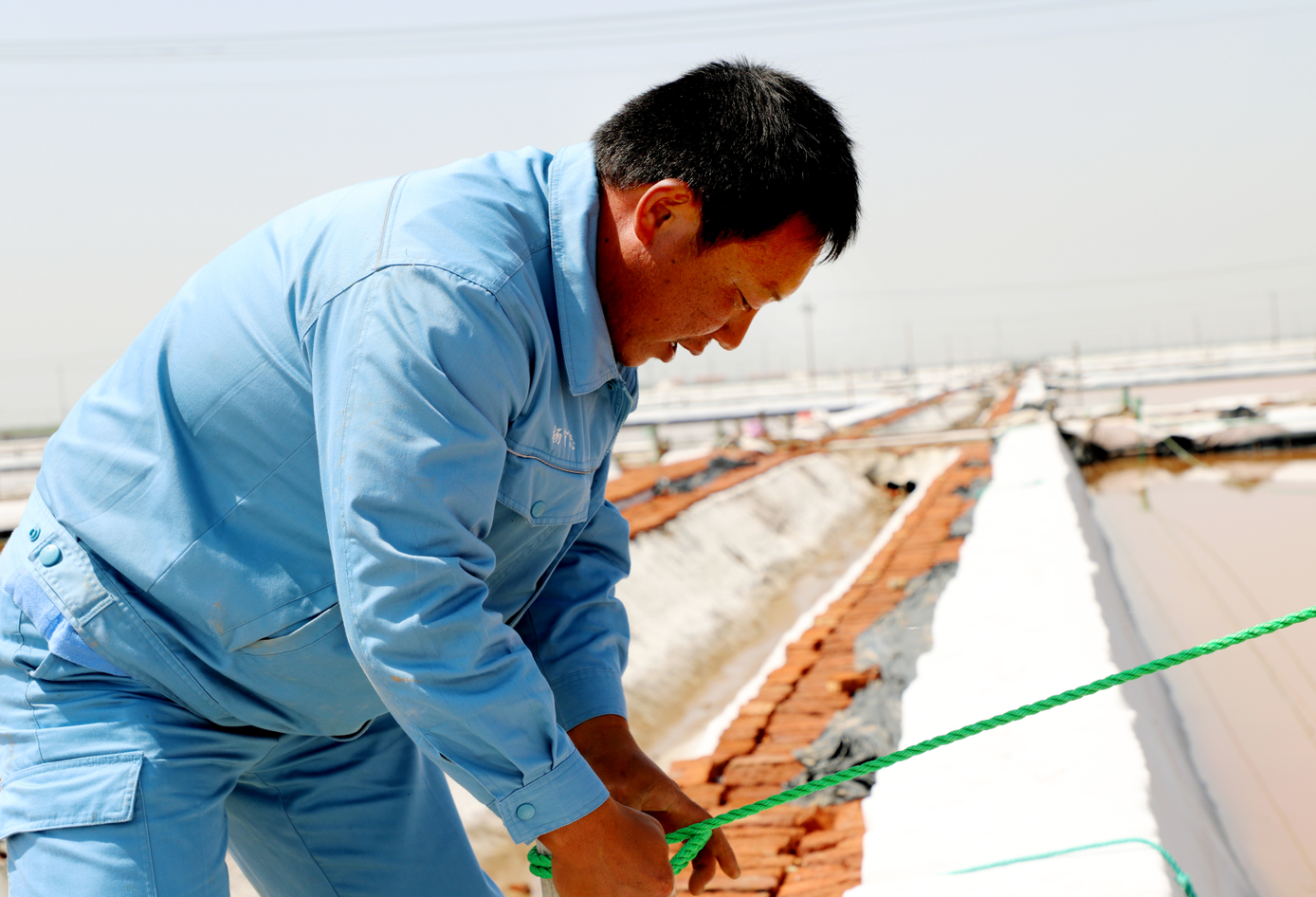 進(jìn)入二季度以來,新河制鹽分公司積極響應(yīng)投資公司開展的“拼搏二季度,實(shí)現(xiàn)雙過半”競(jìng)賽活動(dòng),鼓足了干勁,掀起大干二季度熱潮。5月23日,在新河制鹽公司的七班,幾名員工正在換裝新塑料布,只見有的釘壓條,有的扣樁繩,還有的在插塑料布的后墻,搶在雨水天氣之前進(jìn)行鹽池塑料布的跟換,鹽池堰的修整,確保鹽池鹵水不跑漏,雨天鹽池不進(jìn)水。