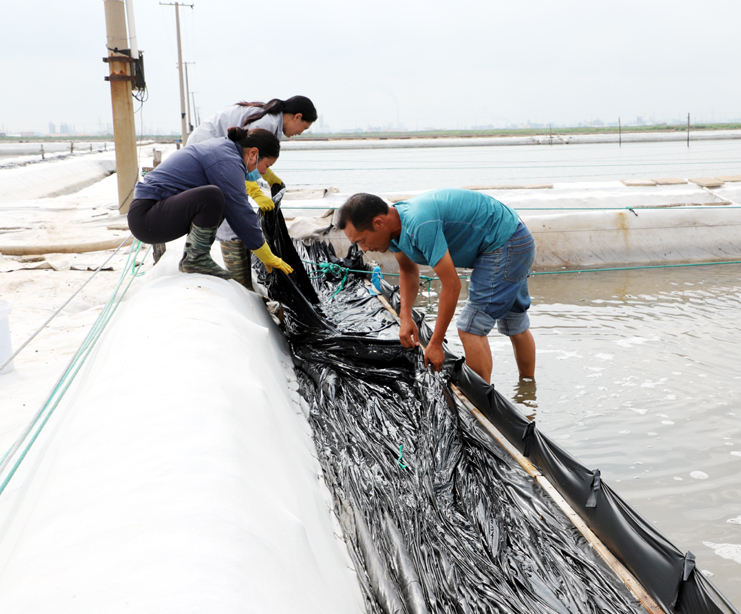 8月15日早,在制鹵區(qū)2班,班長王春好帶著班組的工人準(zhǔn)備干活,安排好每個(gè)人的工作后,大家拿起工具上灘,工人們分散開來,各自忙著手里的活。工人們前后排開,彎腰俯身,用鐵鍬挖溝做堰,為下雨排淡水做好準(zhǔn)備。“踩在鹵水里能感覺像是在“燙腳”,太陽把鹵水曬的滾燙的。”領(lǐng)灘手王春好用衣袖擦著臉上的汗水說,自己在灘上干了有七、八年了,對(duì)于這樣的工作環(huán)境已經(jīng)適應(yīng)了。進(jìn)入八月以來,連續(xù)7天最高溫度達(dá)到35以上,臺(tái)風(fēng)過后,今天的氣溫也達(dá)到了33度,令今年這個(gè)夏天,成為有完整氣象記錄最熱的夏天。跑水工仇海濱,到灘上一個(gè)多小時(shí),以是大汗淋漓,他帶領(lǐng)工人做一些修堰、補(bǔ)塑布、緊繩、還有查跑道頭的活。