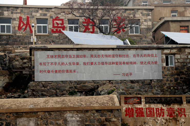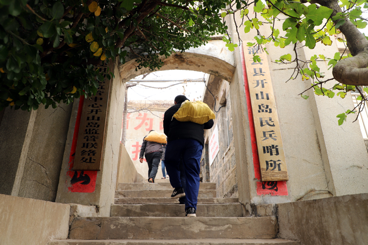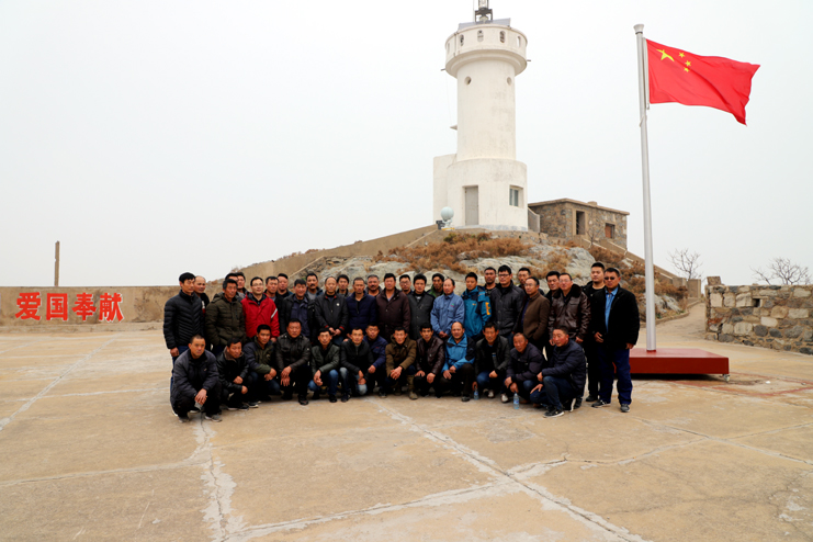 上午8點(diǎn),在發(fā)動(dòng)機(jī)巨大的轟鳴聲中,漁船緩緩駛離港口。近一個(gè)小時(shí)的顛簸,開山島出現(xiàn)在了視野里,由小到大,逐漸清晰。簡(jiǎn)易碼頭上,守島民兵遠(yuǎn)遠(yuǎn)地沖著大家揮手,船上的人顧不上漁船的劇烈晃動(dòng),一個(gè)個(gè)扒著船沿?zé)崆榛貞?yīng)著,所有人的臉上都寫滿敬意和期待。漁船隨著海浪的節(jié)拍上下晃動(dòng)著,班組長(zhǎng)們登上碼頭,就緊緊握住守島民兵的手,對(duì)他們守島衛(wèi)國(guó),無怨無悔堅(jiān)守和付出的愛國(guó)奉獻(xiàn)精神表示欽佩。班組長(zhǎng)們跟隨著守島民兵沿著王繼才夫婦他們當(dāng)年的巡邏路線,拾級(jí)而上,大家一邊感受巡島爬山的辛苦,一邊聆聽著守島民兵講解王繼才夫婦32年守島的艱難困苦和生離死別。