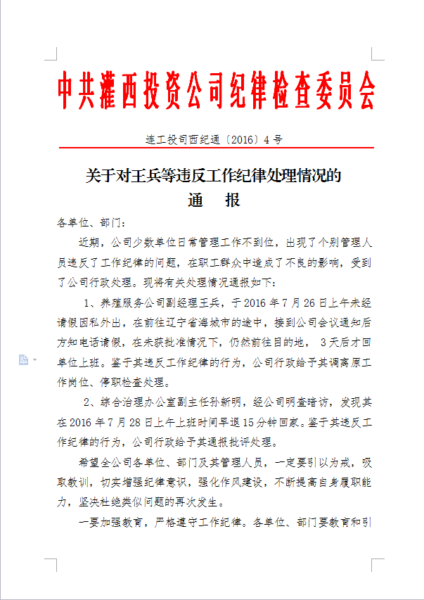 關(guān)于對王兵等違反工作紀律處理情況的通報