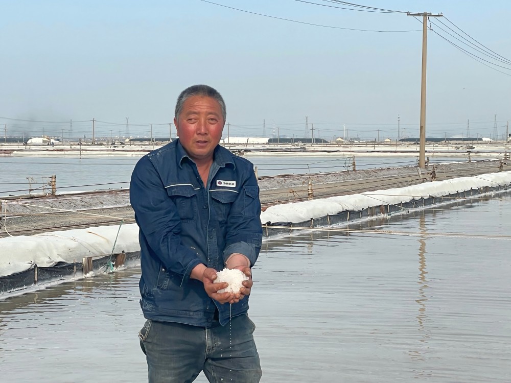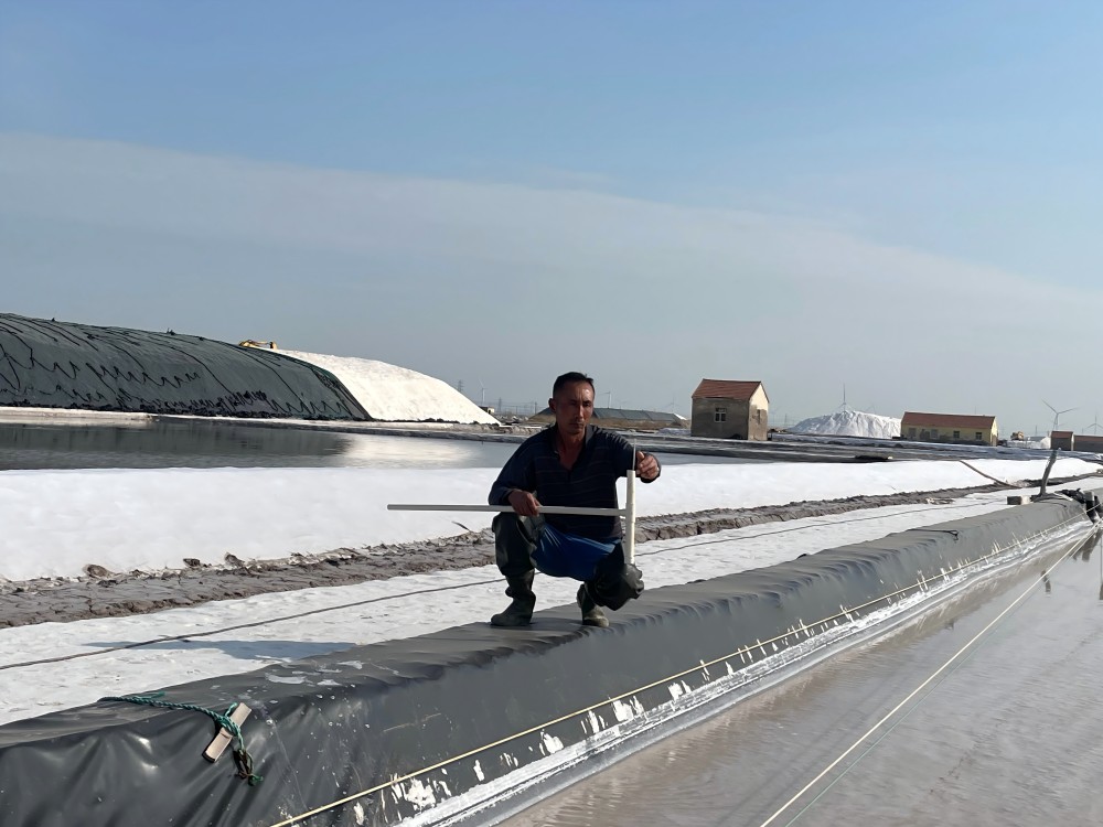 鹽工們的日常,是與陽(yáng)光、礦鹵和鹽灘的對(duì)話。清晨,他們?cè)缭鐏?lái)到鹽灘,檢查鹵水深度和濃度,各節(jié)制、池埝是否滲漏;下午,頂著烈日觀察礦鹵蒸發(fā)狀態(tài);傍晚,仔細(xì)查看鹽粒結(jié)晶情況。遇到極端天氣,全員出動(dòng),爭(zhēng)分奪秒為鹽堆苫蓋防護(hù)布。“雖然辛苦,但看到像小山一樣的鹽堆,就覺得一切都值了?!蹦贻p的鹽工小陳擦著汗笑道。