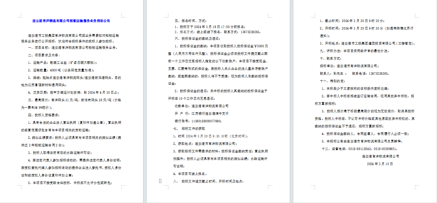 連云港宵洋物流有限公司船舶運輸服務(wù)業(yè)務(wù)招標公告