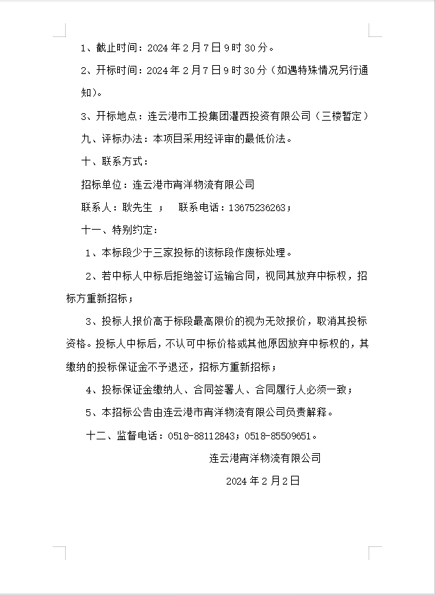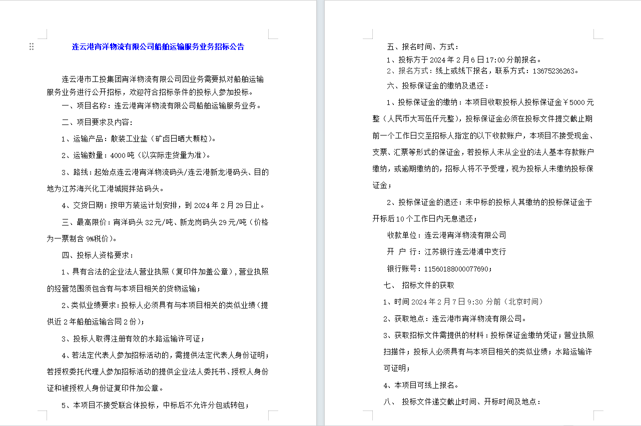 連云港宵洋物流有限公司船舶運輸服務業(yè)務招標公告