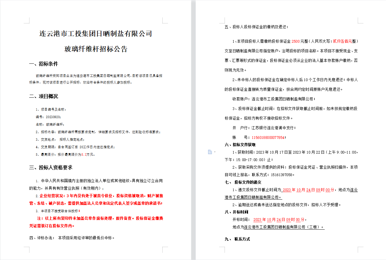 連云港市工投集團(tuán)日曬制鹽有限公司玻璃纖維桿招標(biāo)公告