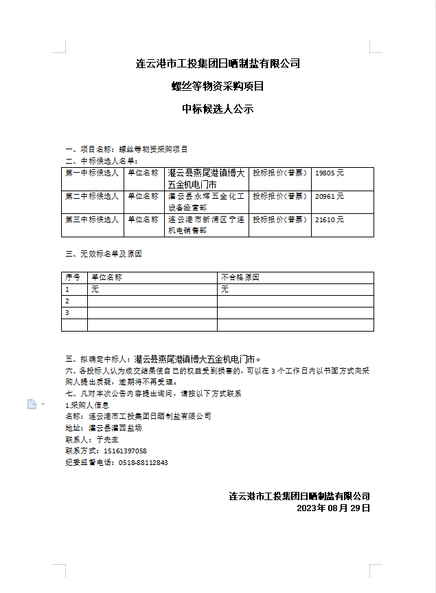 連云港市工投集團日曬制鹽有限公司螺絲等物資采購項目中標(biāo)候選人公示