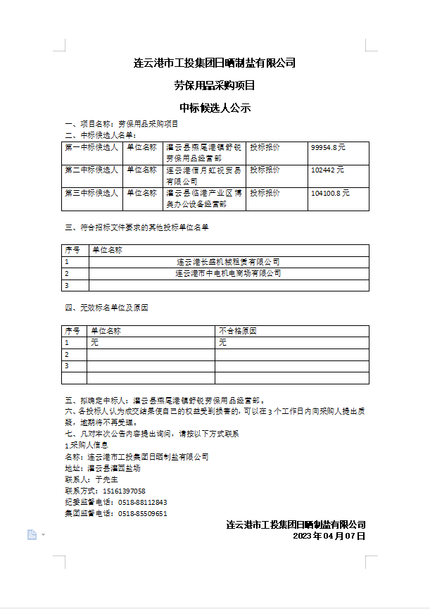 連云港市工投集團(tuán)日曬制鹽有限公司勞保用品采購項(xiàng)目