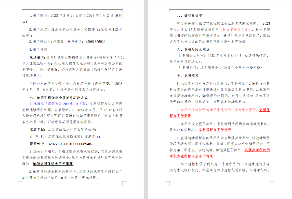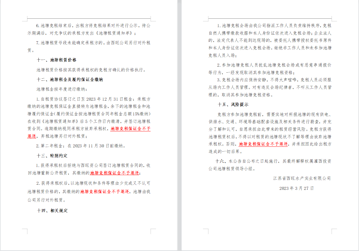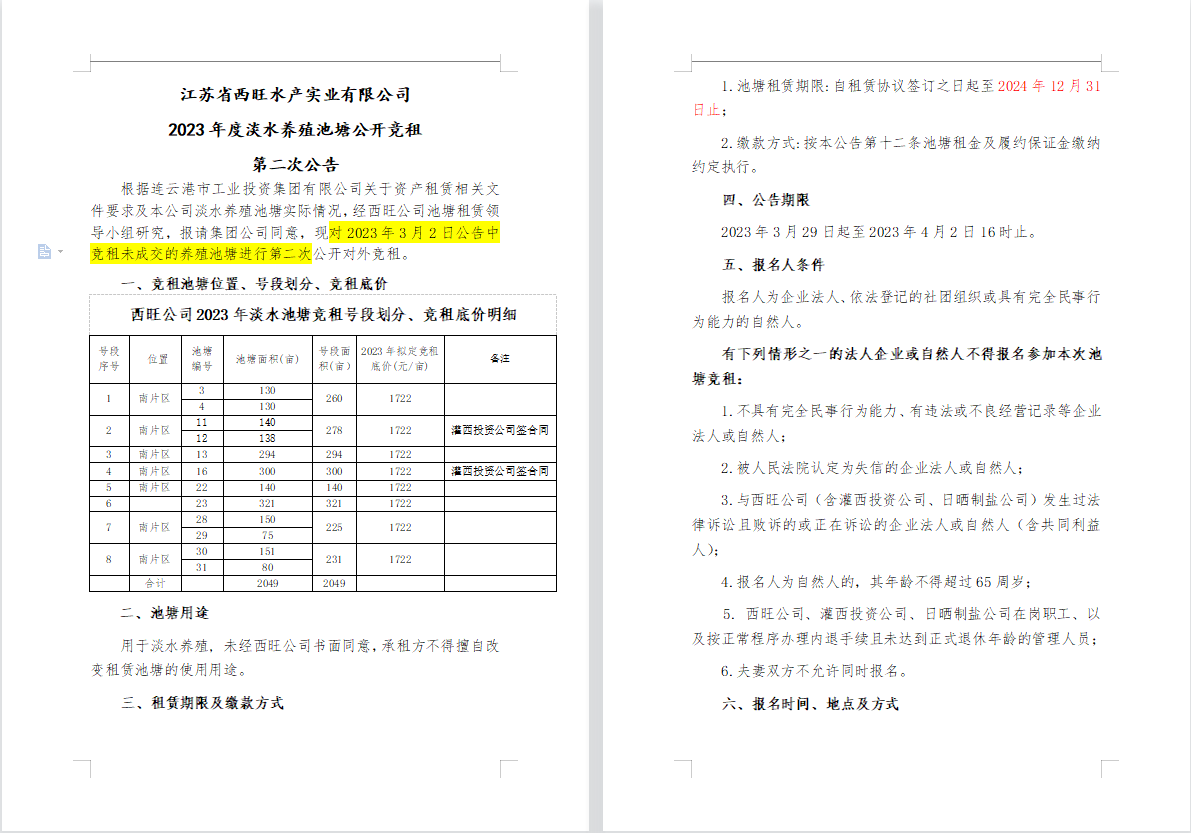 江蘇省西旺水產(chǎn)實(shí)業(yè)有限公司2023年度淡水養(yǎng)殖池塘公開競(jìng)租第二次公告