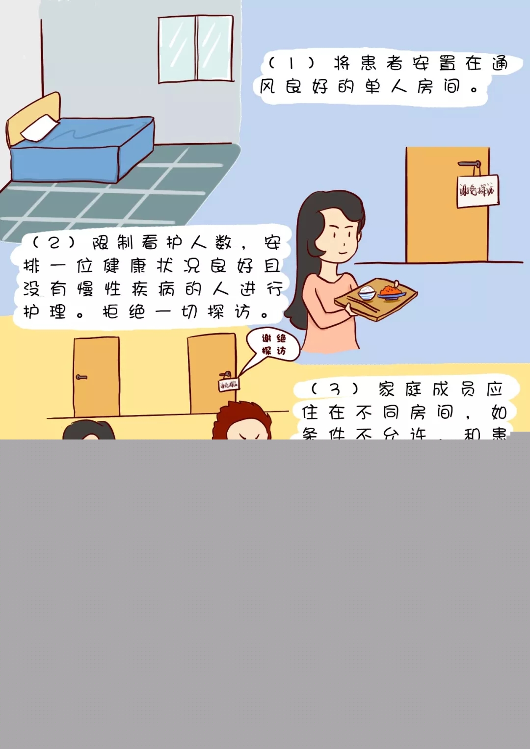 (2)限制看護(hù)人數(shù),盡量安排一位健康狀況良好且沒(méi)有慢性疾病的人進(jìn)行護(hù)理。拒絕一切探訪。