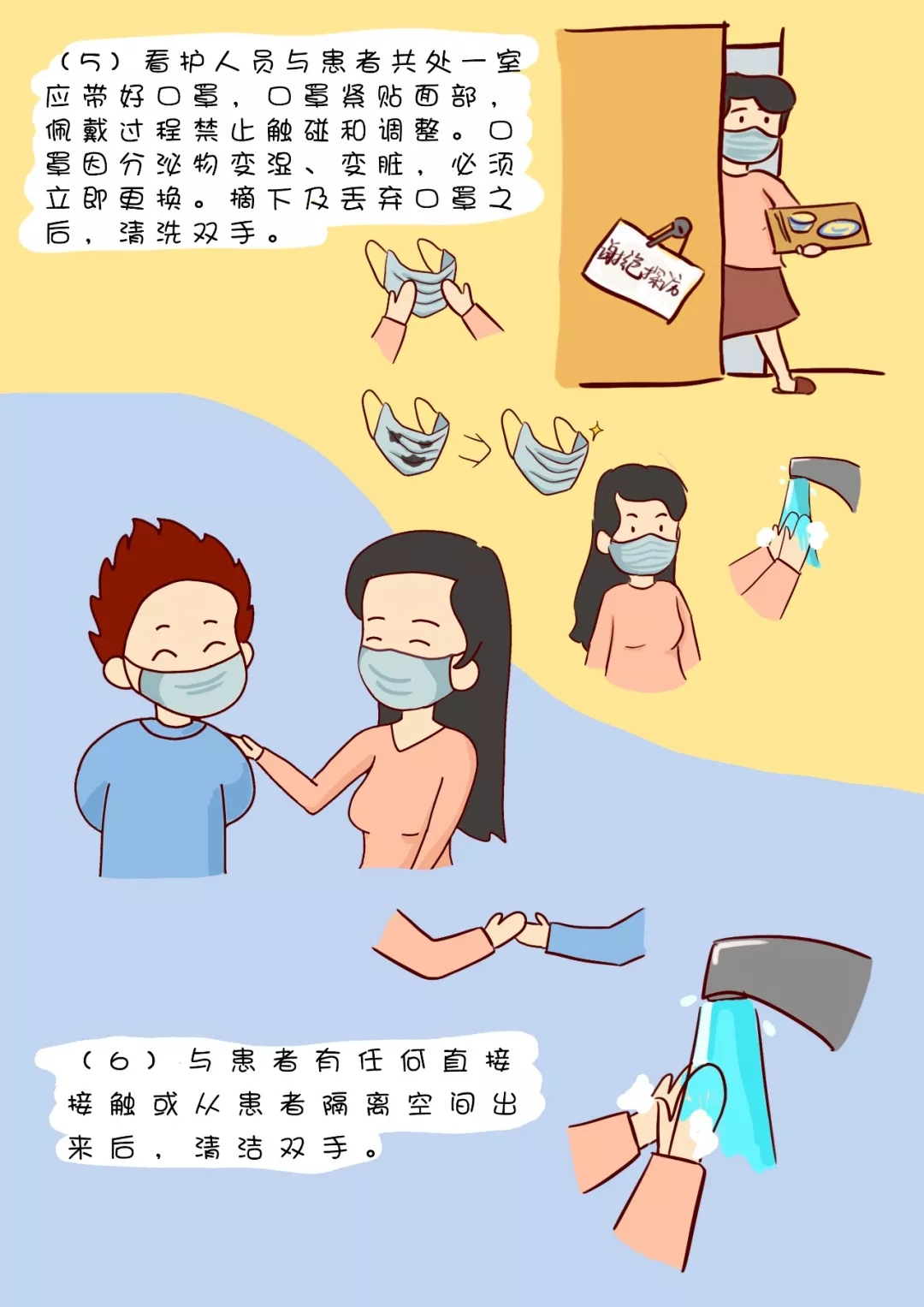 (5)看護(hù)人員與患者共處一室應(yīng)帶好口罩,口罩緊貼面部,佩戴過(guò)程禁止觸碰和調(diào)整??谡忠蚍置谖镒儩?、變臟,必須立即更換。摘下及丟棄口罩之后,清洗雙手。