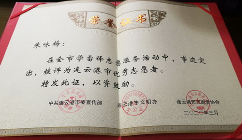 參加疫情防控志愿服務以來,朱詠梅一天都沒有休息,已為超過2萬名旅客檢測體溫。由于事跡突出,在全市學雷鋒志愿服務活動中,被評為連云港市優(yōu)秀志愿者。工作期間,渴了不敢喝水,餓了就吃泡面,雖然很辛苦,但是她覺得很自豪,她說:“我是一名預備黨員,也是一名國企職工,比起那些奮戰(zhàn)在疫情防控一線的醫(yī)務人員,我做的太少了;當前,全國人民都投入到新冠肺炎疫情防控工作中來,我只是為防控工作貢獻了自己的微薄的力量,我相信只要我們團結一心、眾志成城,就一定能早日戰(zhàn)勝疫情,早日打贏這場沒有硝煙的戰(zhàn)爭!(凌家佳)