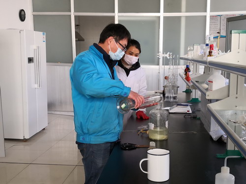 化驗(yàn)室副主任徐永亮(左一)配制消毒液