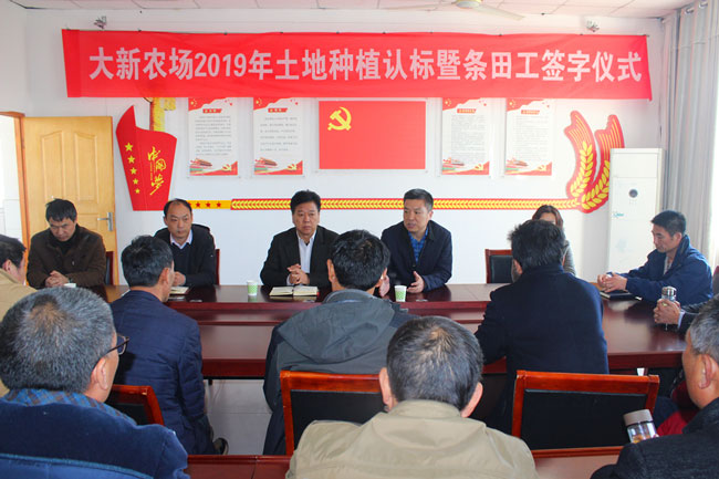 為序時推進農(nóng)業(yè)生產(chǎn),確保各項生產(chǎn)工作快速啟動, 3月22日上午, 公司舉行大新農(nóng)場 2019年土地種植認標暨條田工簽字儀式,公司總經(jīng)理史祥平、副總經(jīng)理周緒祥出席。