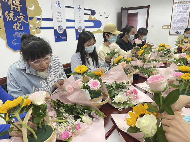 接下來,女工委組織了插花活動,特邀插花老師現(xiàn)場講授插花知識及技法,借用花木來抒發(fā)女職工以花感人,以花育人,意在培養(yǎng)女職工善于表達對母親的愛及祝福。在花藝師的悉心指導下,女職工們用自己靈巧的雙手,盡情發(fā)揮創(chuàng)造力,為母親制作一個美麗、飽含感恩之情的花籃。