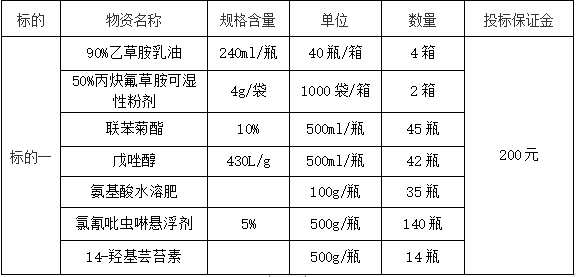 3.原則上由投標單位按貨物需求進行投標,若規(guī)格不符,投標單位也可以根據(jù)自有包裝規(guī)格進行投標。本次招標采購,確定生產廠家或代理商、農藥品種、規(guī)格、劑型和農藥單價。
