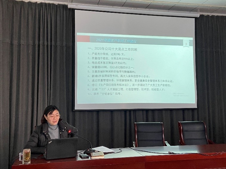 會(huì)上,公司副總經(jīng)理王爽芳總結(jié)了2020年公司十大亮點(diǎn)工作,部署2021年生產(chǎn)重點(diǎn)工作。公司總經(jīng)理助理李洋總結(jié)了2020年生產(chǎn)車(chē)間管理工作,提出車(chē)間2021年“5S”管理目標(biāo)。