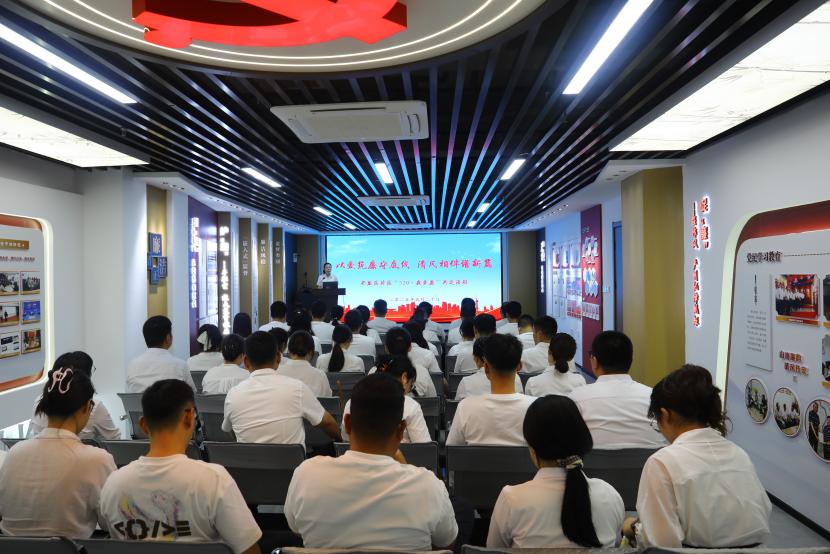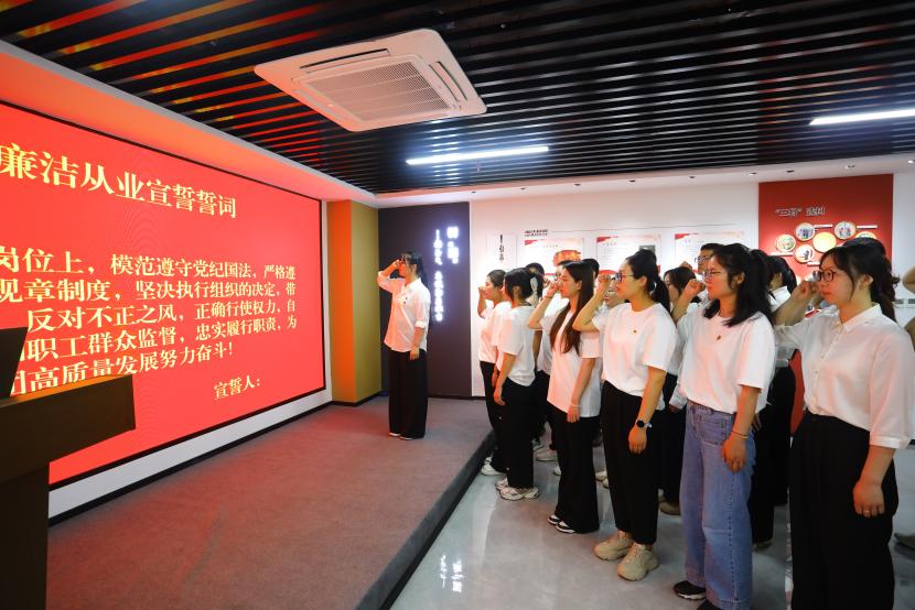 在臺北(華茂)公司環(huán)保裝備產(chǎn)業(yè)園,參加活動(dòng)人員先后參觀了臺北黨員自繪的廉潔漫畫作品、廉潔教育室。隨后,青年黨員代表進(jìn)行了廉潔從業(yè)宣誓,集中觀看了近年來臺北(華茂)公司自拍自導(dǎo)自演的優(yōu)秀廉潔文化微視頻、微電影。