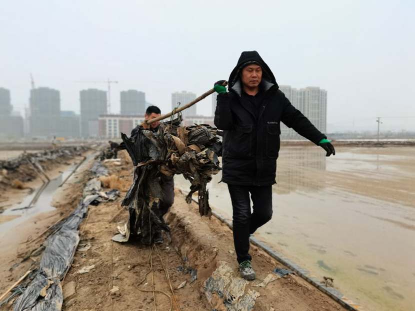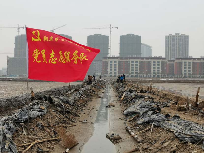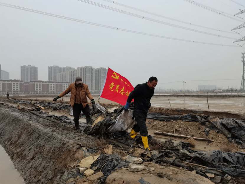 勞動(dòng)現(xiàn)場(chǎng),鮮紅的“黨員突擊隊(duì)”旗幟迎風(fēng)飄揚(yáng),凜冽的寒風(fēng)夾雜著細(xì)雨,絲毫不減大家的勞動(dòng)熱情,個(gè)個(gè)汗流浹背、滿身泥漿,不怕臟不怕累,經(jīng)過3個(gè)小時(shí)的突擊勞動(dòng),共清理1200米、16車池埝垃圾。
