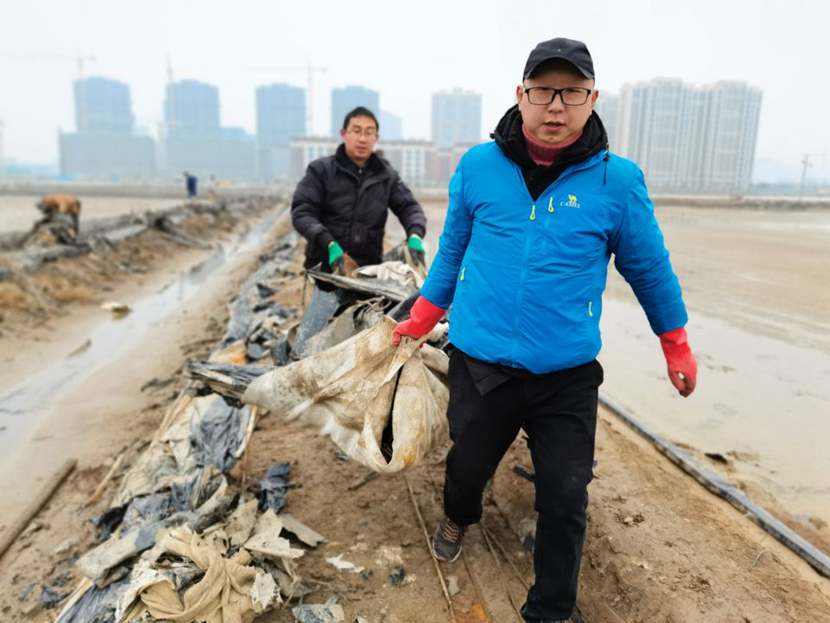 1月10日下午,第一批馳援隊(duì)伍——翔立分公司黨員突擊隊(duì)到達(dá)先鋒班組,結(jié)合海州灣公司黨員突擊隊(duì)共30余名隊(duì)員,穿戴好工作服、水鞋,兩人一組,三人一隊(duì),雙肩挑,三人抬,緊張有序地清理生產(chǎn)現(xiàn)場(chǎng)拆除下來的廢棄的塑布、鋼絲等雜物。