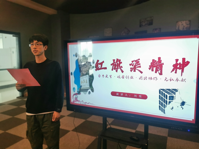 一場演講比賽——“自力更生、艱苦創(chuàng)業(yè)、團結協作、無私奉獻”,青年職工走上講臺,述說著勤勞勇敢的30萬林州人民,苦戰(zhàn)10個春秋,僅僅靠著一錘,一鏟,兩只手,在太行山懸崖峭壁上修成了這全長1500公里的紅旗渠的奮斗故事。