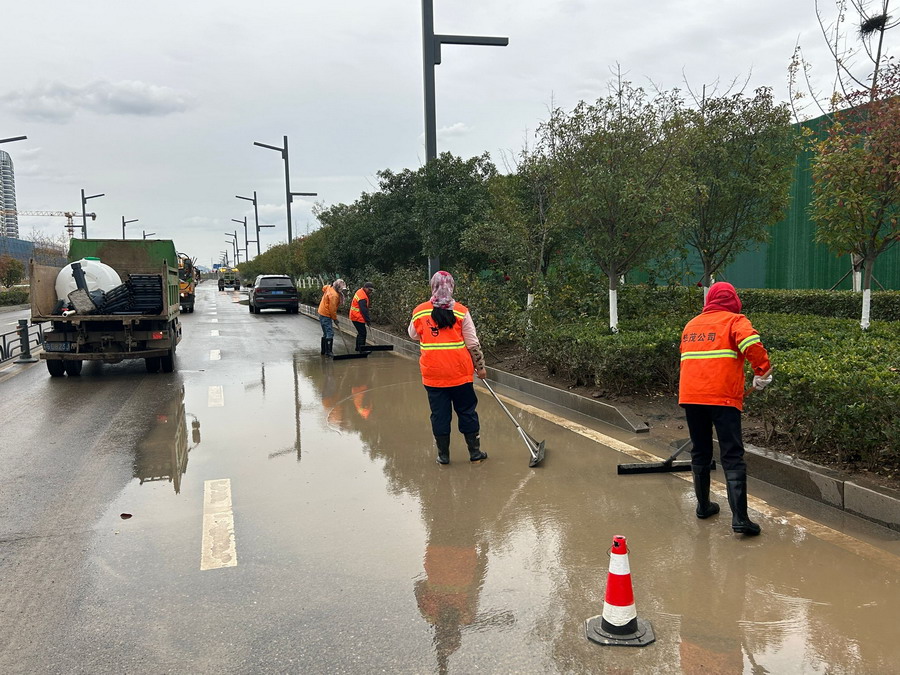 這次任務不同于以往,不僅有大范圍、高頻次的道路沖洗,更有大面積覆蓋防塵網(wǎng),大片區(qū)清掃落葉,由于時間緊迫,無法同班組長坐下來布置,王斌、陳大壹便利用吃飯時間進行討論。他們按照“重大活動有預案,重點現(xiàn)場有人跟,重要路段有人保”的原則提前考察了出行主要路線和主要觀摩地點,對照班組人數(shù)進行細化分工,為了更加精確的將工作計劃進行落實,他們到現(xiàn)場挨個同每個班組長進行溝通協(xié)調,有問題現(xiàn)場解決、有堵點現(xiàn)場調配。