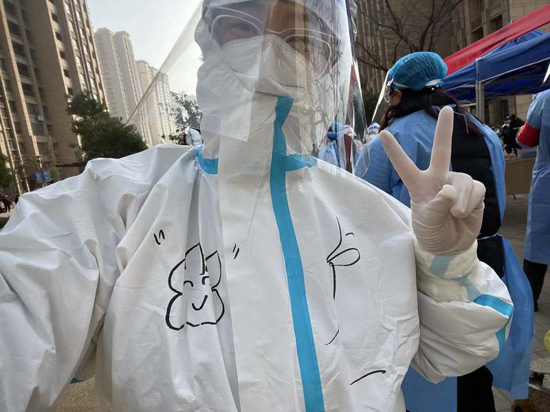 ? 3月12日,晴,8:00到達社區(qū)核酸采樣點,準備上崗,社區(qū)負責人給我們進行了“防護服穿脫”及防疫知識的講解學習等一系列十分細致地培訓后,有點興奮的穿好“大白服”,帶上手套、頭套和面罩,社區(qū)阿姨還幫我在衣服上畫上了可愛的涂鴉;