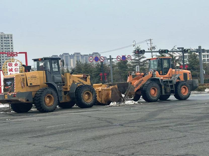 ? ? 一方有難,八方支援。由于本次降雪量大、勢急、持久,單靠環(huán)衛(wèi)分公司無法全面完成任務(wù),在上級領(lǐng)導(dǎo)的統(tǒng)籌考慮下,兄弟單位火速馳援,大綠化、大市政、大采購,大的不僅是業(yè)務(wù)整合,更是人心凝聚,更是集思廣益。翔立、盛達利用鈣液和工程資源優(yōu)勢,通過架設(shè)大型原料桶儲備鈣液水,由3-5輛工具車進行24小時鈣液拋灑,積冰融化速度超出預(yù)期,提升了后期鏟車的工作效率,順利保證了上下班高峰期交通順暢。特別是在2月22日,在兄弟單位的協(xié)助下在清晨8點完成了活動路線保障及市領(lǐng)導(dǎo)掃雪除冰視察。