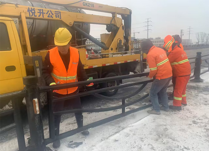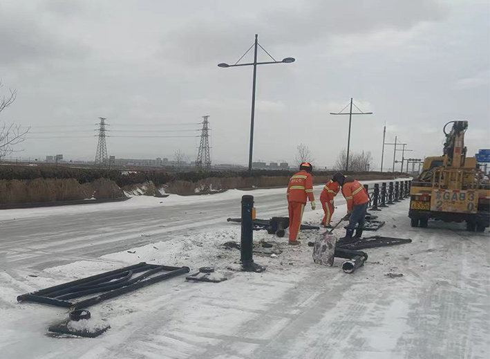 近兩日,因雨雪天氣,道路結(jié)冰濕滑,車輛行駛過程中發(fā)生意外,造成港前大道、海濱大道、228國道等地段發(fā)生多起道路護(hù)欄等設(shè)施損壞情況。收到信息后,市政分公司道路養(yǎng)護(hù)人員迅速反應(yīng),在班長(zhǎng)孫寬成帶領(lǐng)下,隊(duì)員們頂風(fēng)冒雪第一時(shí)間趕赴現(xiàn)場(chǎng)。