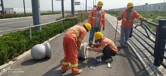 維修班組成員經(jīng)過多日實(shí)地考察,結(jié)合道路現(xiàn)場(chǎng)實(shí)際情況制定了維修計(jì)劃,并對(duì)部分道路上擋車樁點(diǎn)位、間距設(shè)置進(jìn)行了合理調(diào)整,來規(guī)避擦碰現(xiàn)象發(fā)生。在石化三路一處施工現(xiàn)場(chǎng),兩組隊(duì)員頂著炎炎烈日正在非機(jī)動(dòng)車道上進(jìn)行擋車柱安裝工作,他們配合默契,利用開孔鉆、鐵锨等工具開孔、清掏、埋設(shè)樁柱,然后用混凝土填充、壓實(shí)地下部分,最后整平路面。安裝好之后將有效阻止機(jī)動(dòng)車隨意占用人行通道,達(dá)到安全目的。本次施工共安裝維修擋車柱36個(gè)、穩(wěn)固球狀擋車石約180多處。